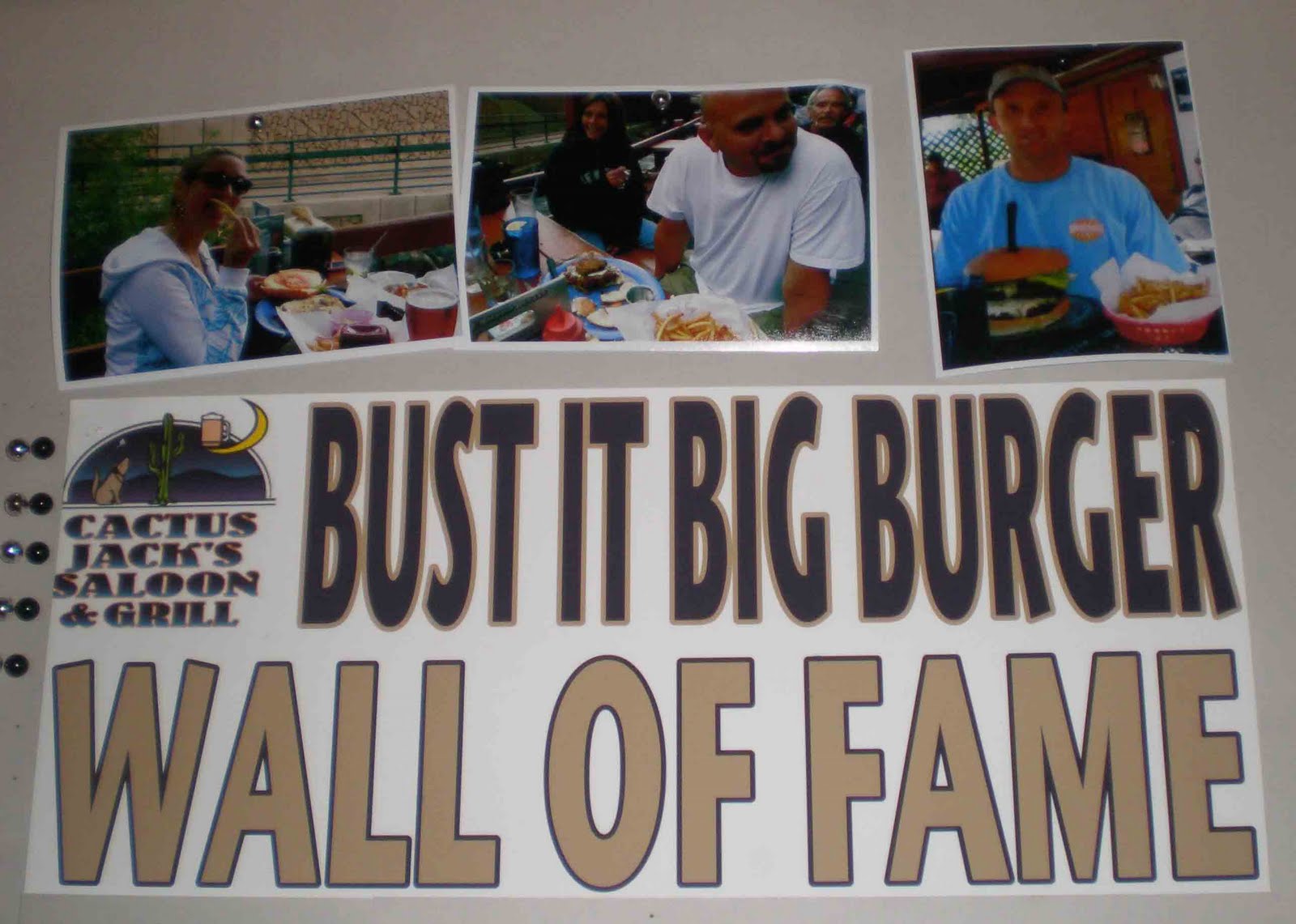 After successfully completing the “State Champion” burger at Digger’s Diner, Andrew “A-Bomb” Lane had the restaurant create a custom burger challenge weighing 4.5 pounds. The contest report includes a picture of the “Wall of Fame” for challenge finishers which has a photo of a woman who reportedly claimed to be the “#3 pro eater”.