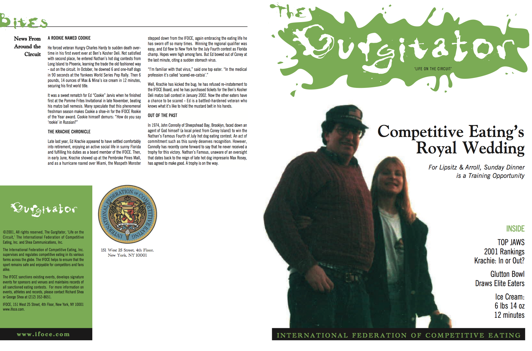 MLE has posted a 2001 edition of its Gurgitator publication to twitter. Article topics include Kevin Lipsitz & Lorraine Arrol's marriage, the Glutton Bowl, Gut Buster, Cookie Jarvis' rookie of the year candidacy, Don Lerman's Cloud Burger record and the top 70. There are 2 people in that list currently ranked: Badlands Booker (#9) and Brian Seiken (#65) (Large images: page 1 | Page 2) December 18, 2014 at 7:15 am by